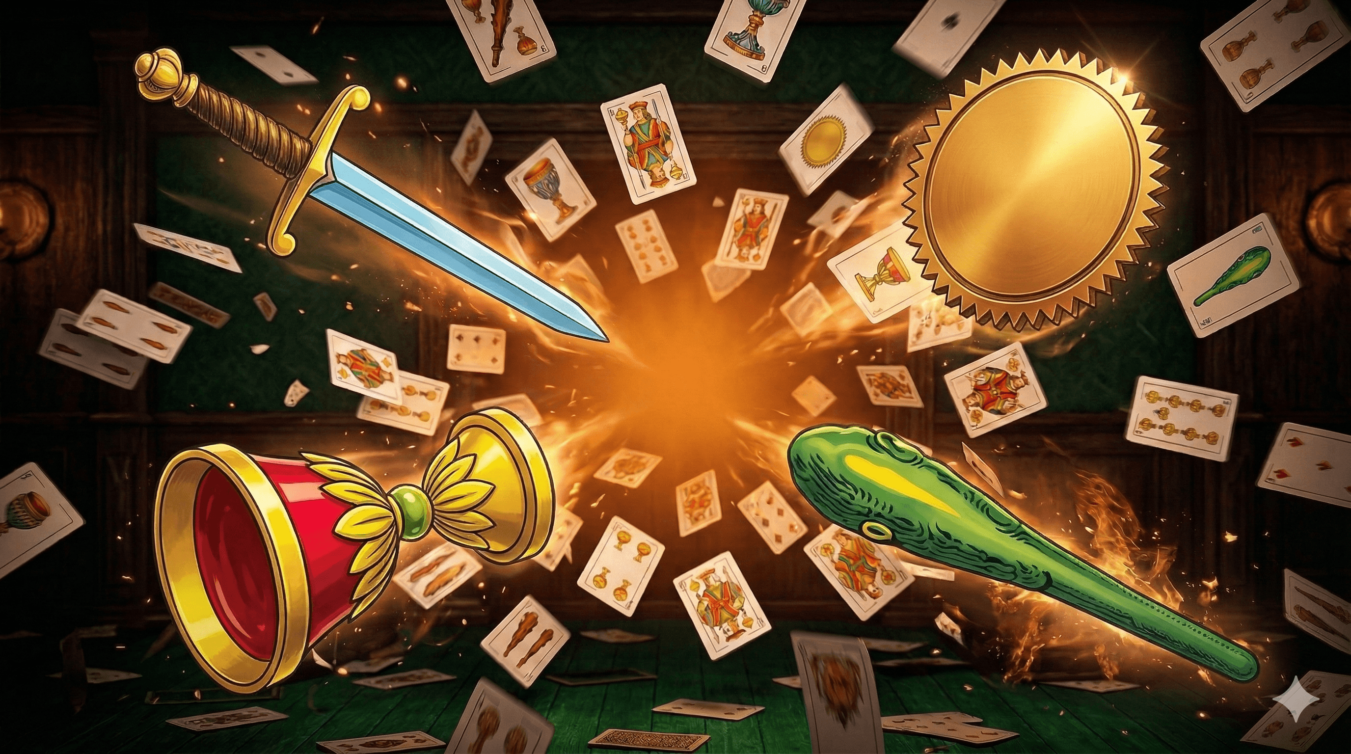 Mesa de juego clásica con la baraja española tradicional. Juega en parejas contra rivales reales o IA. Todas las reglas del guiñote aragonés.